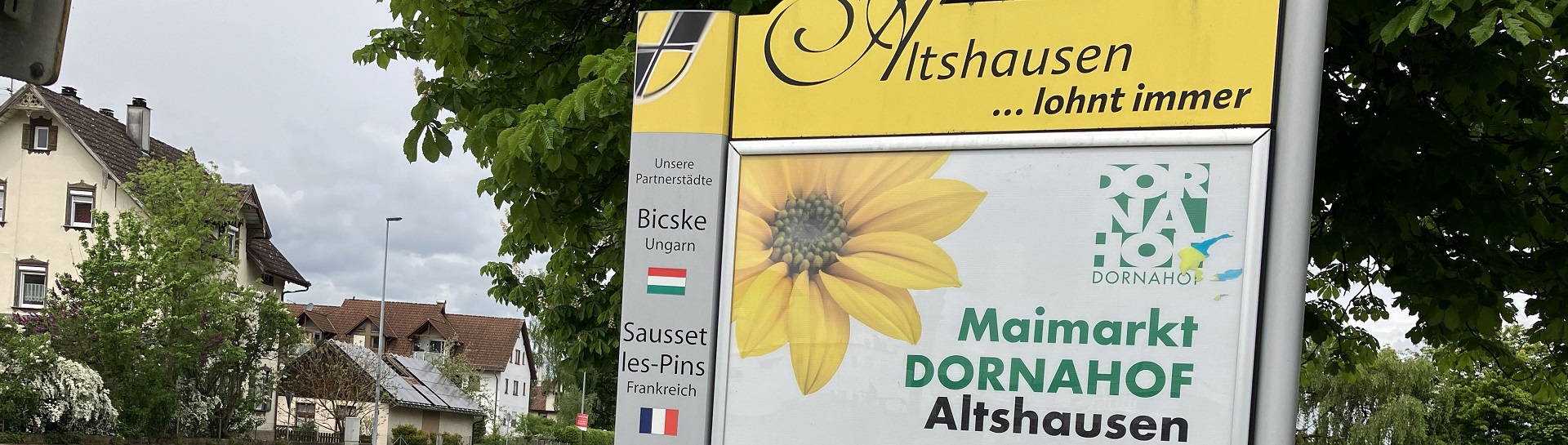 Flohmarkt und Blümlesmarkt: An den Ortseingängen von Altshausen werden Passanten und Autofahrer auf den Maimarkt am DORNAHOf aufmerksam gemacht.