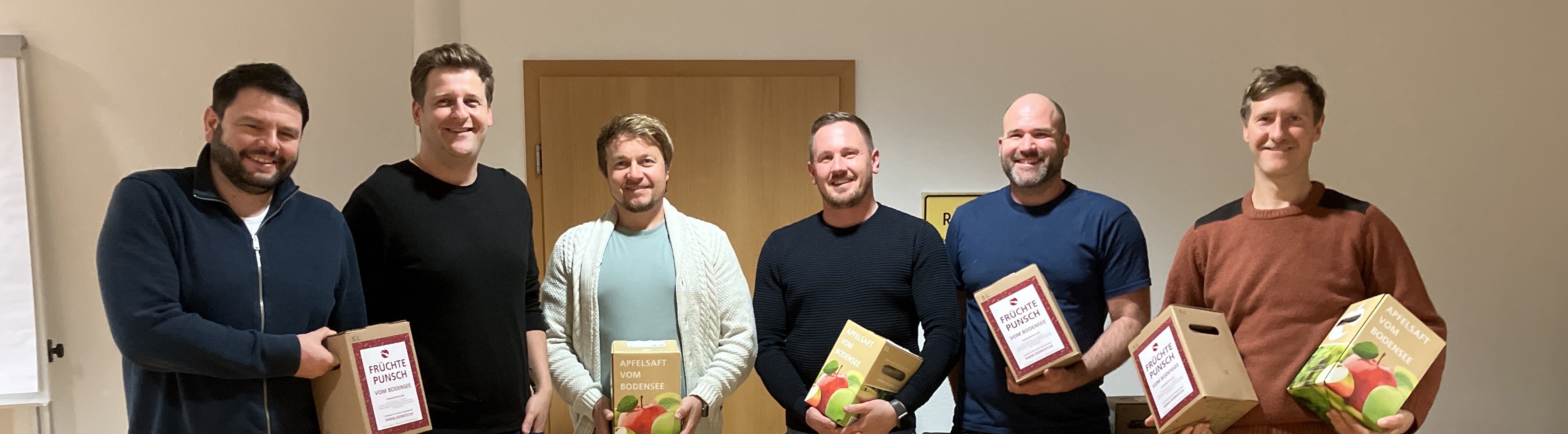 Bei der Spendenübergabe am DORNAHOF Ravensburg – Württemberger Hof hatten die Mitglieder des sozialen Netzwerks Round Table 37 Ravensburg gleich mehrere Spenden im Gepäck: 40 Liter Punsch, Weihnachtsgebäck und die Zusage für eine Geldspende in Höhe von 3.000 Euro, die für die Möblierung eines Zimmers im Ambulant Betreuten Wohnen verwendet werden soll. Foto von links: Stefan König, Felix Wurm, Alex Bentele, Victor Hecht, Pascal Birkle, Albrecht Leuth.