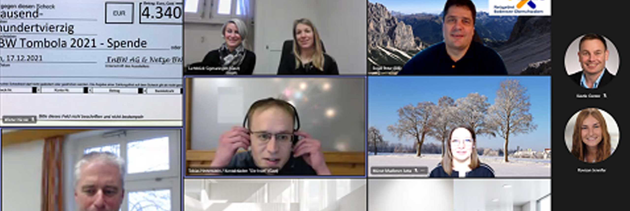 Aufgrund der aktuellen Corona-Lage fanden Tombola und Spendenscheckübergabe virtuell statt. Mit dabei waren bei der virtuellen Spendenübergabe (Foto: EnBW Energie Baden-Württemberg AG ), von links, oben: der Spendenscheck, Stephanie Rozek und Stefanie Oswald von Lichtblick, Peter Engel, BR-Vorsitzender der Netze BW. Von links in der Mitte: Tobias Hertenstein vom Kontaktladen „Die Insel“ und Jutta Münst-Madlener. Unten von links: Vorstand Volker Braun vom Einrichtungsverbund DORNAHOF, Bianca Pietretzki und Florian Fuchsloch von der BR-Netze-BW und und Jürgen Schelkle, BR-Vorsitzender EnBW, (kleine Fotos, rechts) Günter Kästle (BR-Netze-BW) und Jennifer Rovisan (BR EnBW).