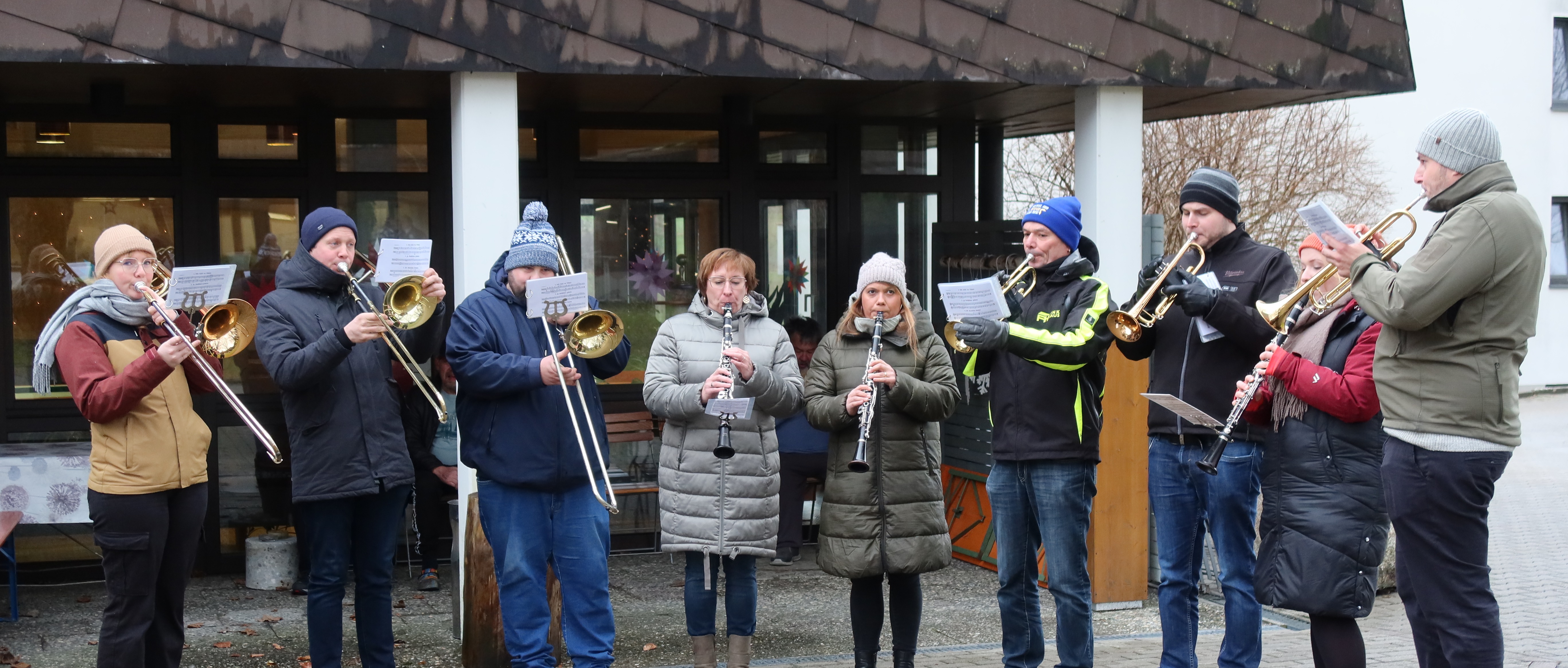 Am 24.12.2023 gab es eine ganz besondere Premiere. Der Musikverein Altshausen spielt immer am Heiligen Abend in den Straßen von Altshausen Weihnachtslieder und kam zum ersten Mal auch an den DORNAHOF, um zu spielen. Andächtig wurde der Gruppe von Musikerinnen und Musikern gelauscht. Das war dann für alle ein ganz besonderes Geschenk zu Weihnachten, ob Mitarbeitende oder Bewohnerinnen und Bewohner. An dieser Stelle ein herzliches Dankeschön an den Musikverein Altshausen. Wir freuen uns jetzt schon auf eueren Besuch bei unserem nächsten Weihnachtsdorf.