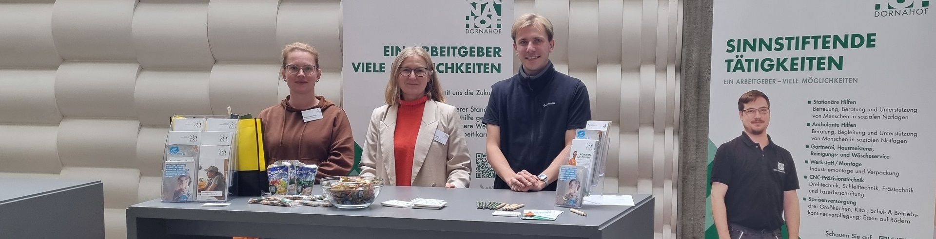Der DORNAHOF hat sich beim Karrieretag der RWU Hochschule Ravensburg-Weingarten mit dem DORNAHOF-Infostand als Arbeitgeber präsentiert. Bei dieser Veranstaltung Mitte November können sich die Studierenden der RWU alljährlich über berufsbezogene Themen informieren – vom Nebenjob über Abschlussarbeiten bis hin zu einem möglichen Berufseinstieg. In diesem Jahr haben rund 130 Unternehmen aus der Region teilgenommen.