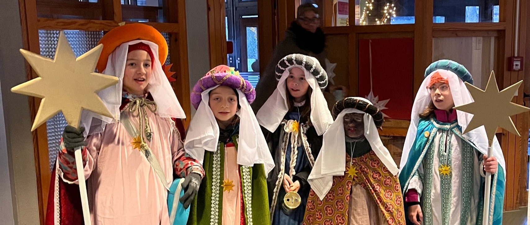 Vielen Dank an die Sternsinger für den wertvollen Besuch. Die Sternsinger erinnern mit ihren Kronen und den königlichen Gewändern an die Heiligen Drei Könige, die zum Jesuskind an die Krippe kamen. Heute bringen die Kinder als Könige den Segen Christus Mansionem Bendedictat/Christus segne dieses Haus (C + M + B) in alle Häuser und Wohnungen.