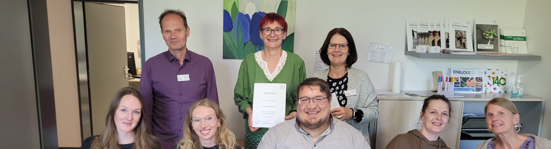 Seit 30 Jahren ist die Sozialpädagogin Christa Schöffend im Dienst der Diakonie tätig. Am 15. Mai besuchte die pädagogische Geschäftsführerin des Einrichtungsverbunds DORNAHOF, Ulrike Wachter, den Standort in Tübingen, um Christa Schöffend persönlich zum Jubiläum zu gratulieren und gemeinsam mit ihr und dem Team in kleiner Runde zu feiern. Im Gepäck hatte sie eine Urkunde sowie ein kleines Präsent in Form eines Gutscheins. Ulrike Wachter betonte: „Christa Schöffend prägt die Arbeit des DORNAHOF Tübingen seit vielen Jahren durch ihre Fachlichkeit und ihr großes Engagement maßgeblich mit.“