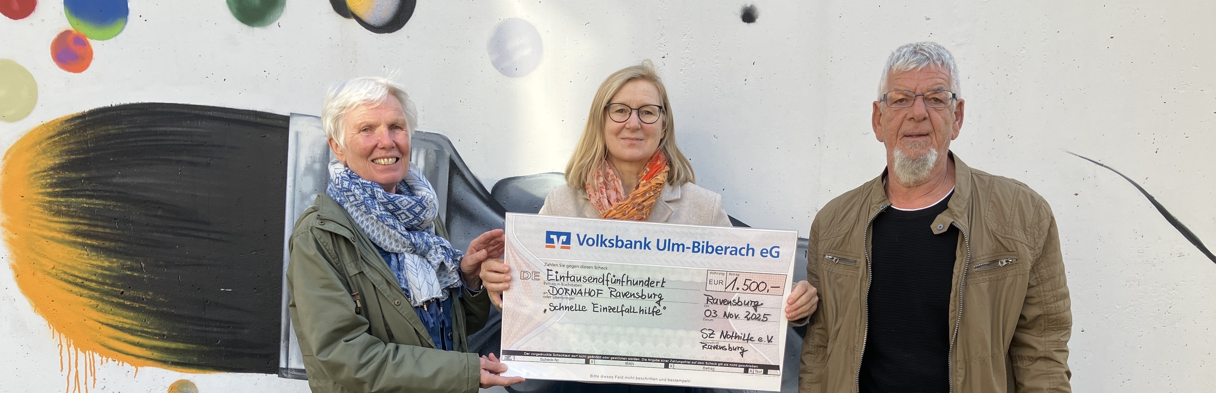 Für das Projekt Schnelle Einzelfallhilfe erhielt der DORNAHOF Ravensburg – Württemberger Hof jetzt von der SZ-Nothilfe Ravensburg eine finanzielle Unterstützung in Höhe von 1.500 Euro. Der gemeinnützige Verein aus ehrenamtlichen Unterstützern hilft Menschen in Armut und Not, fördert aber auch Projekte. Am DORNAHOF Ravensburg unterstützt die SZ-Nothilfe seit vielen Jahren die individuelle Hilfe in besonderen Fällen und nun auch das Projekt Schnelle Einzelfallhilfen.